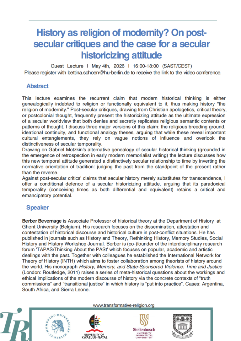 As of January 2022, the new German–South African International Research Training Group (IRTG) „Transformative Religion: Religion as situated knowledge in processes of social transformation“ will take up its work. Funded jointly by the South African National Research Foundation (NRF) and the German Research Community (DFG) with a gross total of roughly € 4,9 million (ZAR 82 million), the project transdisciplinarily investigates the impact of religion in processes of social transformation and the impact of these transformations on religion in contemporary global societies with an intercontinental perspective. It seeks to contribute to recent academic research and public debates on the complex relationship between religion and society.